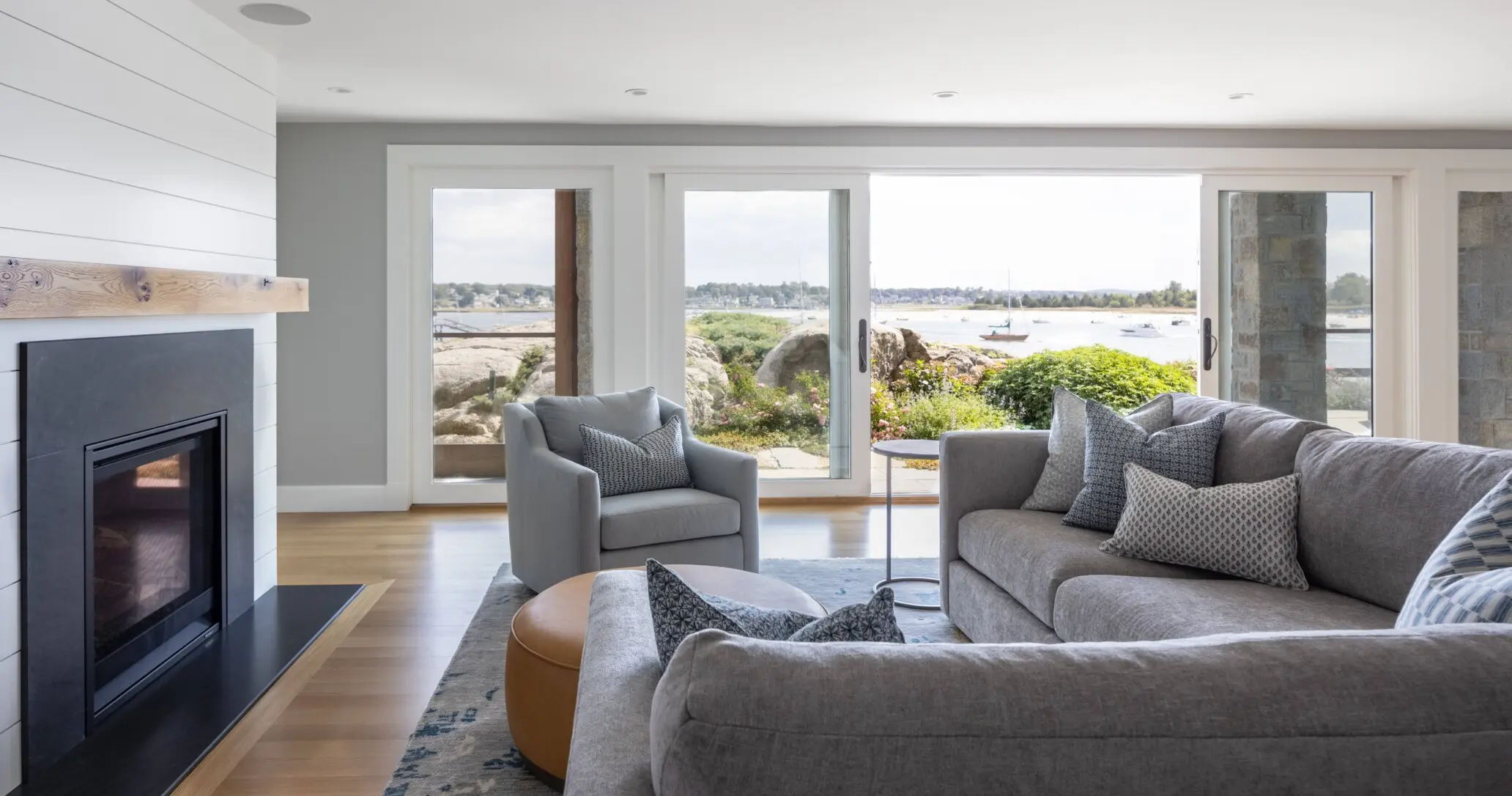 The kitchen, living room, and lower-level feature oversized fold-away doors that lead out to retractable screened-in decks and patios overlooking the water. The massive 25-foot, six-panel doors in the living room required meticulous engineering and design to support a doorway so wide. The original deck off the kitchen had a shallow, low-roofed porch, which limited the beautiful view. SV Design extended the vaulted ceiling design in the kitchen out to the deck and added V-Groove paneling and a new granite fireplace for the ultimate indoor-outdoor connection.